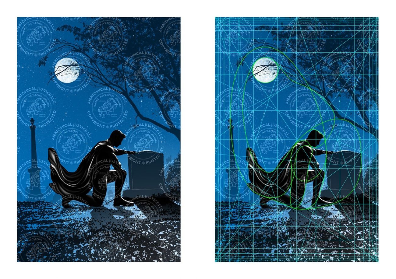 We apply this theory to more than just medical illustrations. The cover of Superhero Grief: The Transformative Power of Loss also uses the golden ratio to convey emotion. The image depicts a superhero kneeling at a grave at night. Ron created a path of movement between the components in the illustration using a grid based on the golden ratio. The path is continuous and always leads back to the focal point: the mourning superhero.