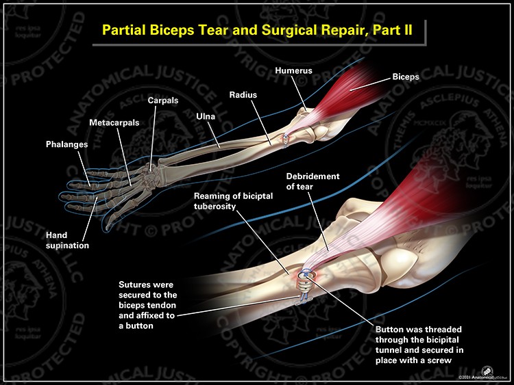 This two-page exhibit shows a partial biceps tendon tear and its surgical repair. First, the tear was debrided, and the bicipital tuberosity was reamed. Then, sutures were used to secure the biceps tendon to a suture anchor in the radius.